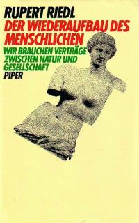 In eingängiger Sprache liefert Riedl dafür einen Entwurf: »Er soll zeigen, wie unsere Natur beschaffen ist und in welcher Weise einerseits das soziale Milieu unserer Zivilisation mit unserer Ausstattung wieder verträglich gemacht werden kann, und andererseits unser Weltbildapparat mit der Komplexität dieser Welt (Teil 1). Wie unsere Haltungen zwischen Altruismus und Egoismus (Teil 2), zwischen Pluralismus und Uniformismus (Teil 3) und zwischen Zwecken und Zwängen (Teil 4) pervertiert wurden und restauriert werden könnten, schildern konkrete Beispiele. Und welche Verträge mit unserer Gesellschaft zu schließen wären (Teil 5), das will ich aus der gemachten Erfahrung herleiten.« |